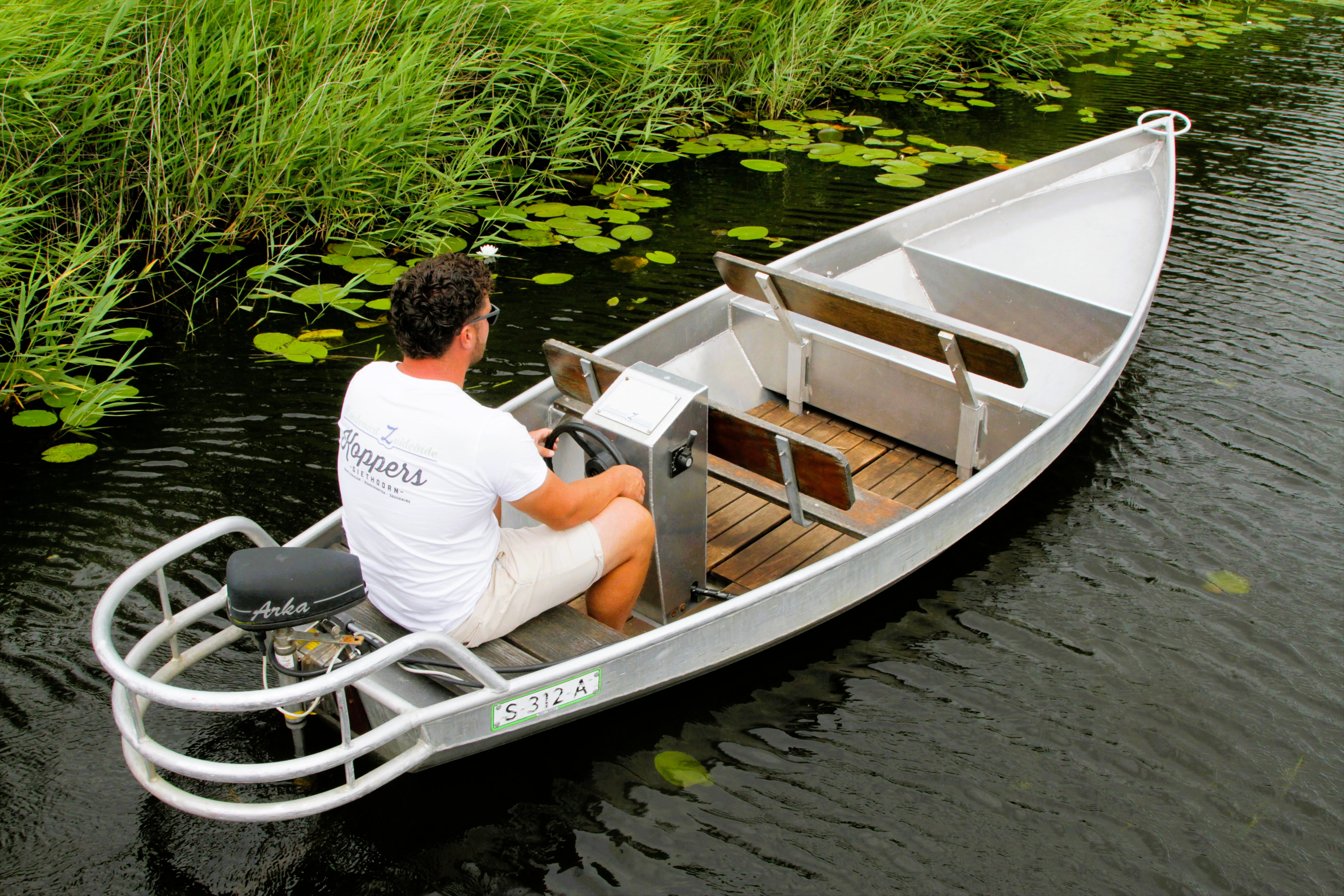 De Electrosloep is voorzien van rugleuning en luxe kussenset waardoor u comfortabel kan zitten. De boot wordt bestuurd met een stuurwiel zoals in een auto.